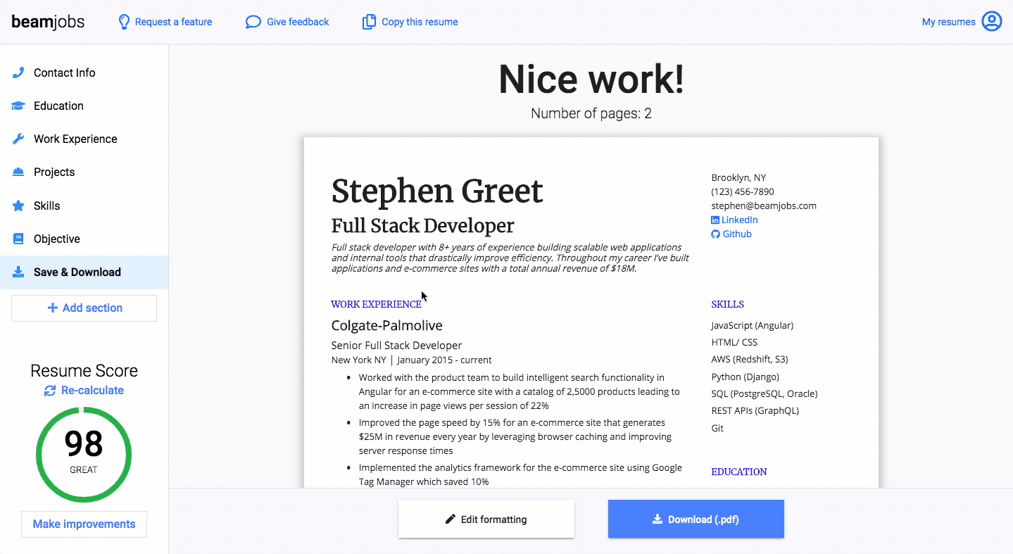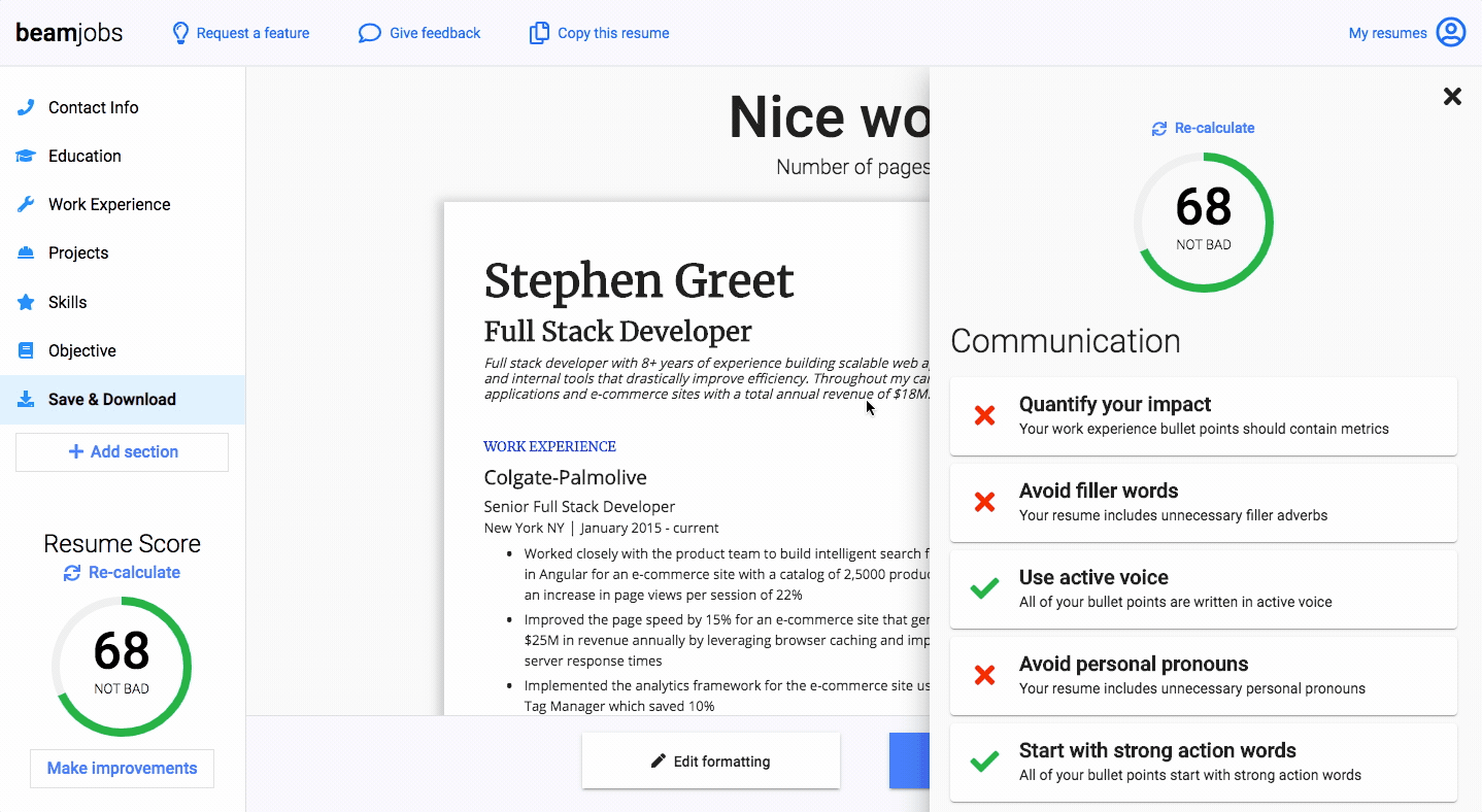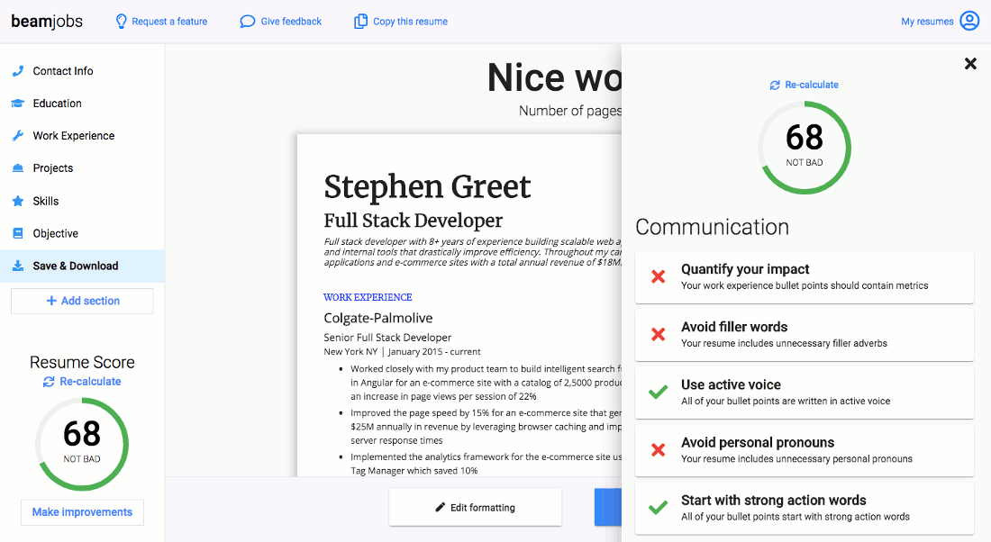 After seeing your score, decide whether your score warrants a deeper review of your resume, some quick fixes for easy wins, or even if it would be best to build a resume from the ground up. Whatever you choose BeamJobs has the tools to support you every step of the way.