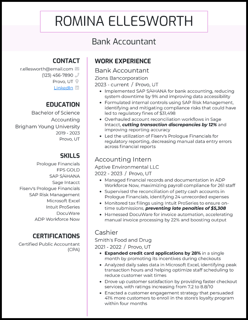 - Mentioning a degree in accounting from Brigham Young University in your bank accountant resume is more than just a formality. It says that, at the very least, you meet the basic requirements for the job and acquired the necessary theoretical knowledge to get things done.